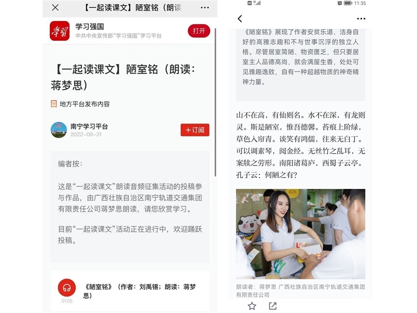 軌道地產(chǎn)商業(yè)公司黨支部蔣夢(mèng)思同志參加了此次活動(dòng),她朗讀的作品《陋室銘》經(jīng)南寧軌道交通集團(tuán)推選,榮登“學(xué)習(xí)強(qiáng)國(guó)”平臺(tái),在“一起讀課文”欄目展播。